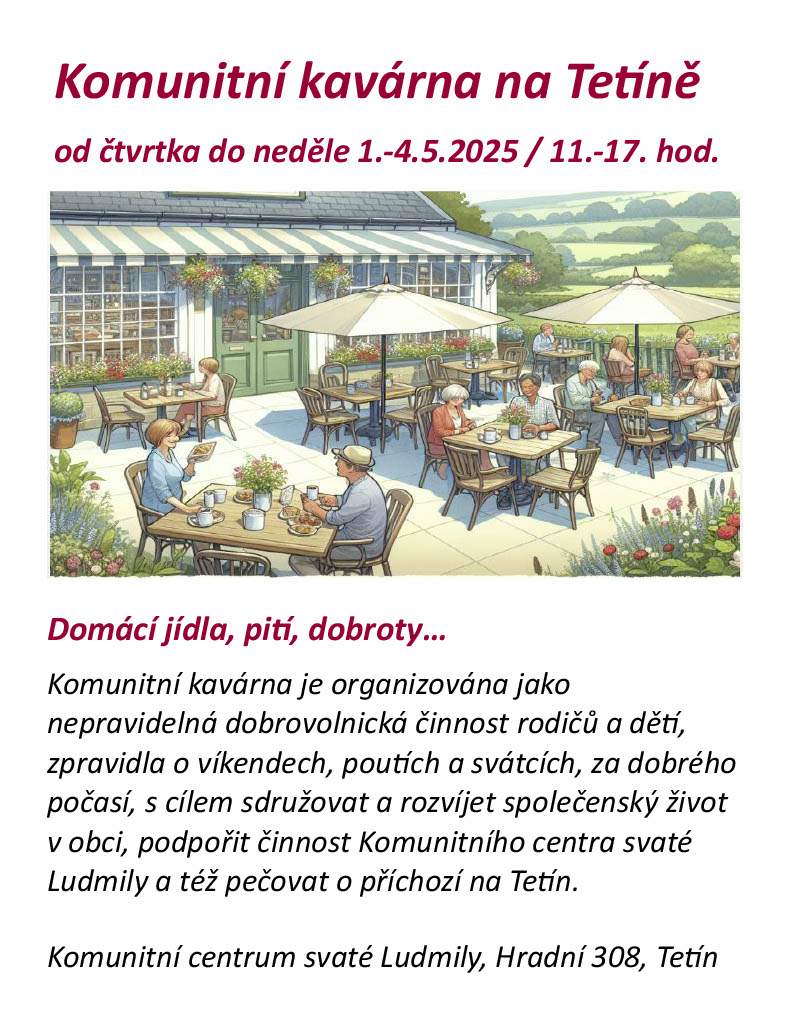 Od čtvrtka do neděle 1.-4.5. bude otevřena Komunitní kavárna na Tetíně v době 11.00-17.00
